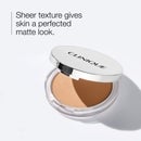 Image 2 - An image of a compact of Clinique powder surrounded by various shades of powder, with text indicating coverage as sheer, finish as matte, and skin type as dry combination to oily skin.