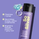 Matrix So Silver Purple Shampoo cleanses and neutralises unwanted yellow undertones. It nourishes blonde hair, illuminates highlights, and adds brightness to colour-treated and natural hair ranging from grey to white shades. It starts to neutralise from the first application when used with the So Silver system.
