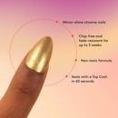 STEP 3. TOP COAT & CHROME: Apply a layer of Mylee No Wipe Top Coat and cure for 60 seconds. Using the applicator, gently buff your chosen chrome pigment onto the nail until you achieve a mirror finish. After applying the pigment, use a nail file to lightly buff around the free edge of each nail. This removes excess pigment, helps the top coat adhere better, and prevents lifting.