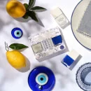 Achieve a salon-worthy finish at home with the nails inc. Made In Mykonos Nail Polish Duo. Featuring an award-winning formulation, the high-quality duo features creamy white and ultramarine shades, alongside evil eye nail stickers.