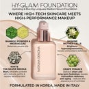 To even out the skin tone with undetected naturally radiant coverage, apply the HY-GLAM™ FOUNDATION using a foundation brush starting from the centre of your face and blending outwards for medium-buildable coverage. For full-coverage, apply with your finger or a makeup sponge. Apply powder for an ultra-matte luminous finish. Due to its self-setting formula, the HY-GLAM™ FOUNDATION delivers a flawless, perfected natural skin finish, even when worn alone.