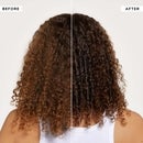 Image 1 - A split image shows a persons curly hair from the back, with the left side labeled BEFORE showing lighter brown, less defined curls and the right side labeled AFTER showing darker, shinier, more defined curls. Image 2 - A white tube of Philip Kingsley Elasti-Styler Multi-tasker for all hair types Soin multi-action pour tous types de cheveux 5-IN-1 TREATMENT TRAITEMENT 5-EN-1 100ml 3.38 fl oz is displayed alongside a list of KEY INGREDIENTS including BABASSU OIL Conditions and nourishes, OLIVE OIL Helps hair look shiny and healthy, and PHYTOLASTIN Helps hair retain moisture. Image 3 - A hand with light pink nails holds a white tube of Philip Kingsley Elasti-Styler hair treatment, with usage instructions on the left reading ELASTI-STYLER: HOW TO USE 1. Work a pea-sized amount through towel-dried mid-lengths and ends. 2. Blow dry and style as usual. Can also be used on dry hair to tame flyaways. The tube label also states PHILIP KINGSLEY ELASTI-STYLER Multi-tasker for all hair types Soin multi-action pour tous types de cheveux 5-IN-1 TREATMENT TRAITEMENT 5-EN-1 100ml 3.38 fl oz.