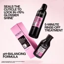 Combining an advanced pH formulation and Acidic Shine Complex, the treatment diminishes the appearance of breakage and brittleness, restoring a mirror-like shine with a fuller-looking finish. Citric acid visibly seals the cuticle with moisture, supporting up to 72 hours** of hydration, while amino acids and conditioning agents deposit glossing molecules for the silkiest lustre that lasts until your next wash.