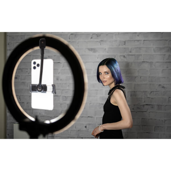 360 astetta kääntyvän pallonivelen ansiosta rengasvalo voidaan säätää optimaaliseen kulmaan. Älypuhelimen pidike sopii useihin eri laitekokoihin. Kokoontaitettava kompaktia säilytystä varten.