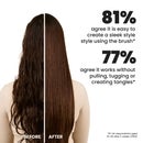 Innovatiivisten piikkien muoto tarkoittaa, että harjan ei tarvitse olla yhteydessä hiustenkuivaimeen, jotta syntyisi jännitettä. Piikit tekevät tämän kyllä itse. Pidä hiustenkuivain turvallisella etäisyydellä siveltimestäsi kuivatessasi varmistaaksesi, että lämpövahinkoa aiheutuu vähemmän tulosten ollessa silti yhtä virheettömiä. Ei sovellu takkujen poistoon.